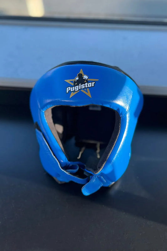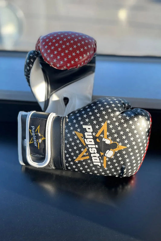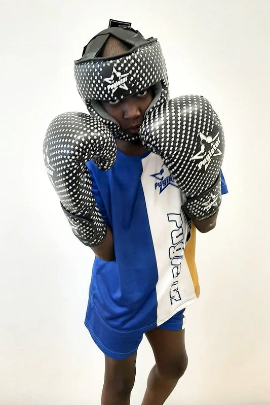 Ens. gants + casque synthétiques noir étoiles blanches Pugistar